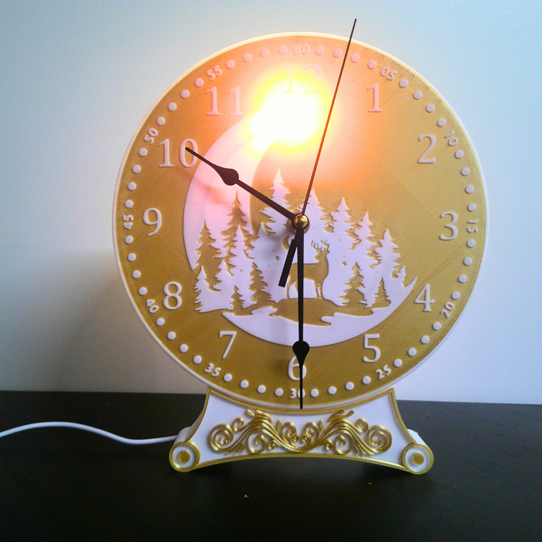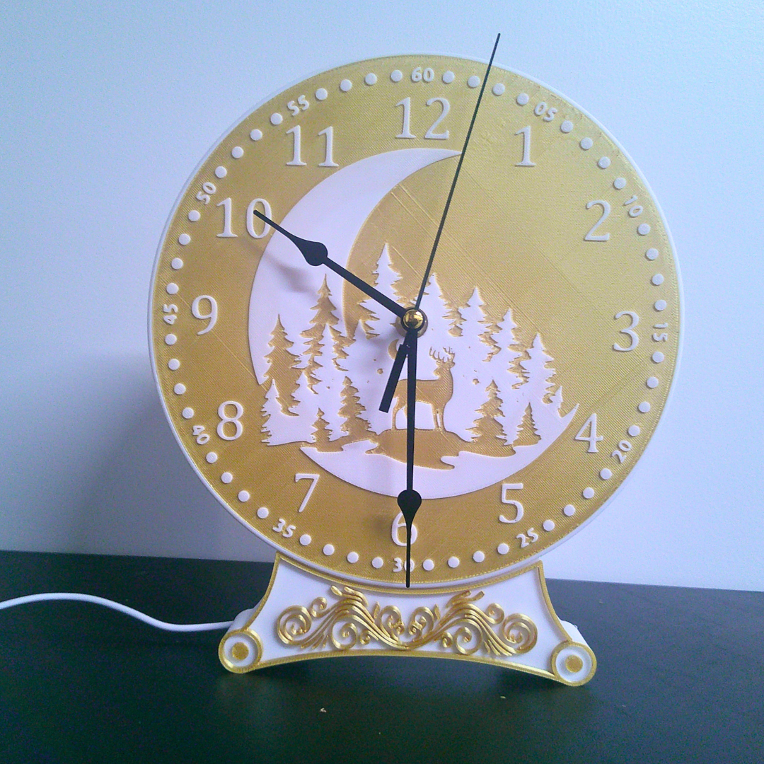 Designed in a clean white-and-gold finish, this clock features a detailed silhouette of the moon, trees, and deer, creating a peaceful woodland scene. When illuminated, it casts a warm glow that adds both function and atmosphere, making it perfect for bedside tables, desks, or cozy corners.