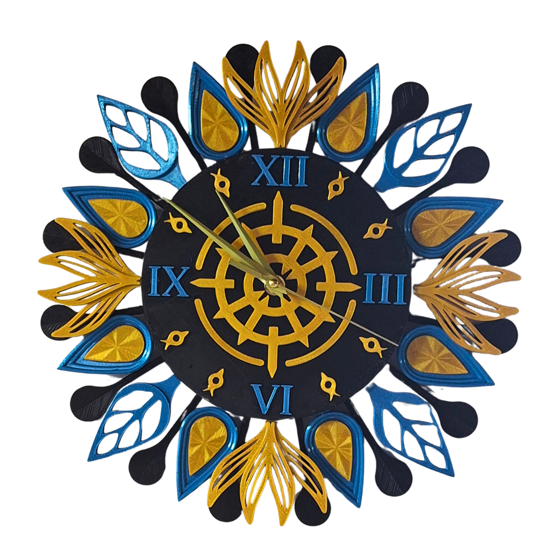 Featuring elegant feather-like patterns in a striking blue-and-gold color combination, this clock is designed to stand out as both a timepiece and a piece of décor. Its detailed design adds texture and visual interest, making it a natural focal point in any room.