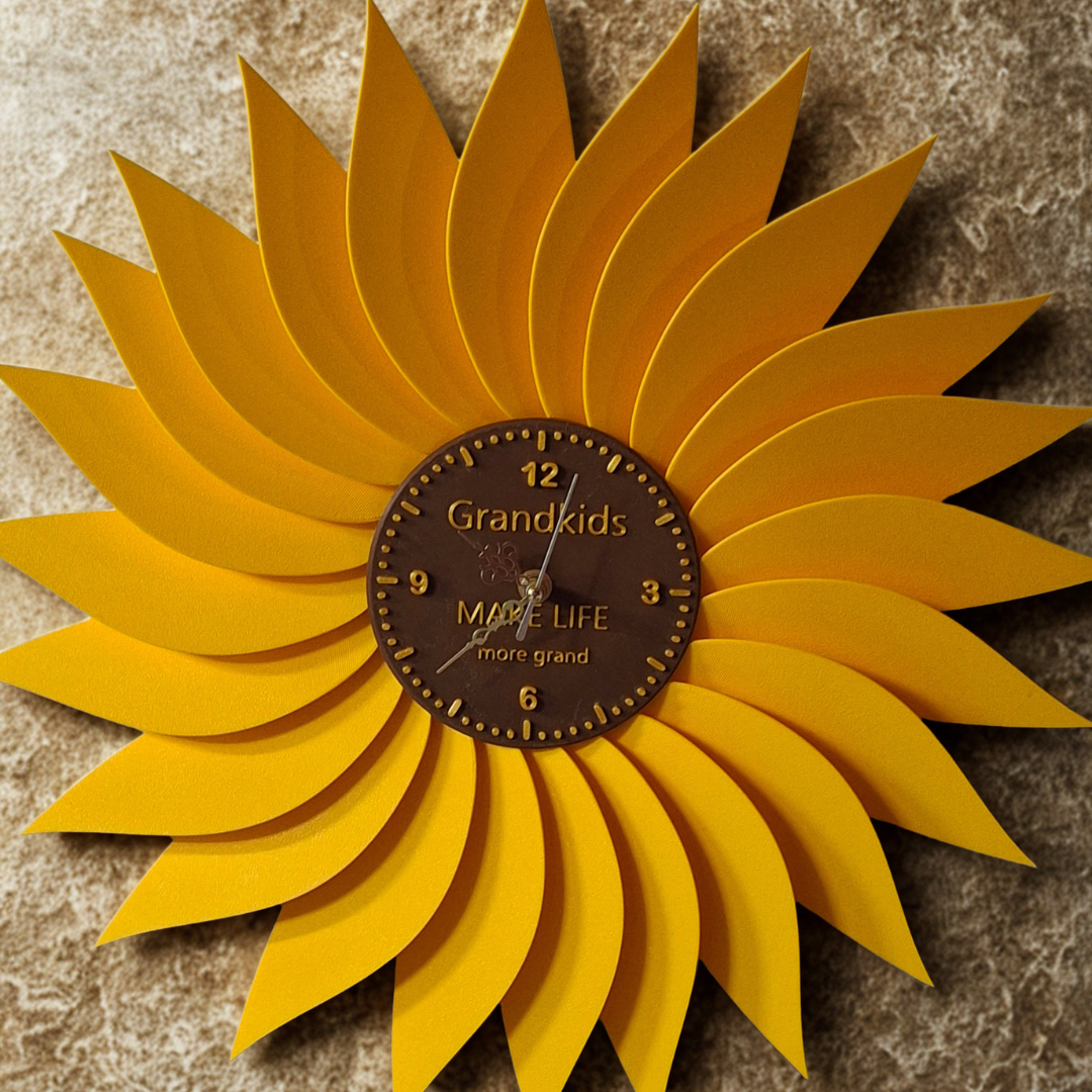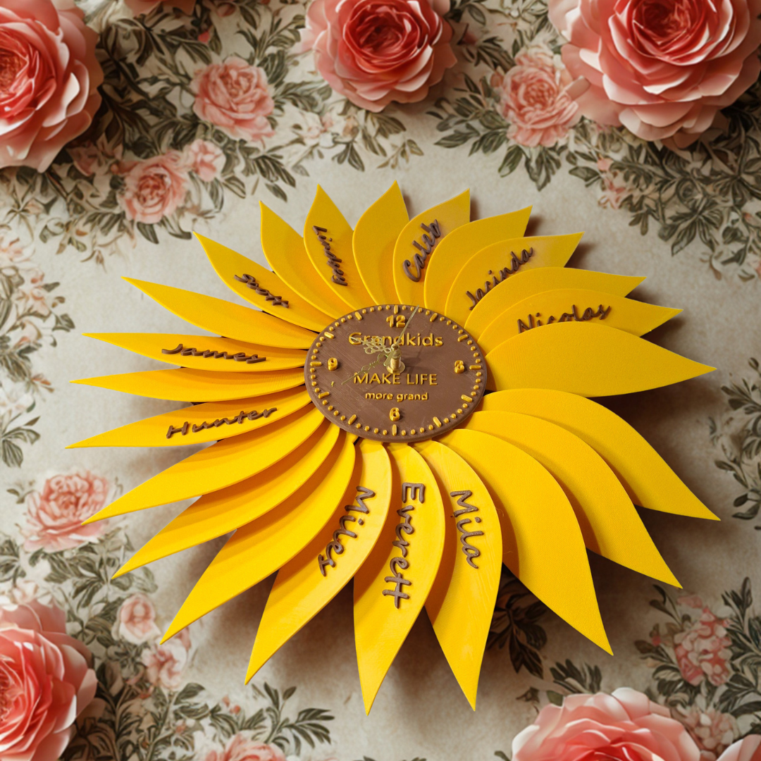 Designed in a bright sunflower shape, this 3D printed clock brings both style and sentiment into your home. The center can feature a custom phrase, while the petals can be personalized with names—making it a perfect gift for grandparents, parents, or anyone special in your life.