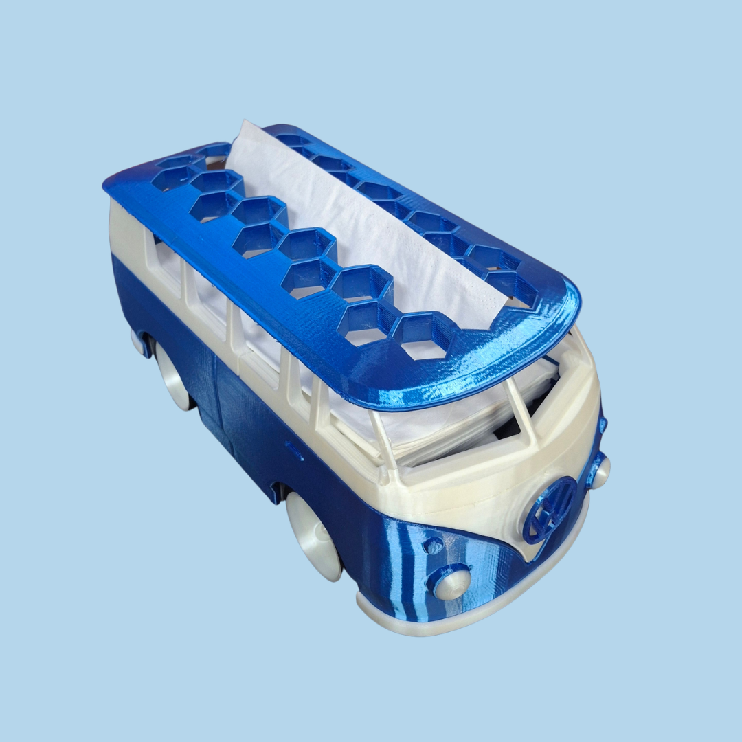 A VW bus-inspired tissue box holder that adds a fun, nostalgic touch while keeping tissues easily accessible.