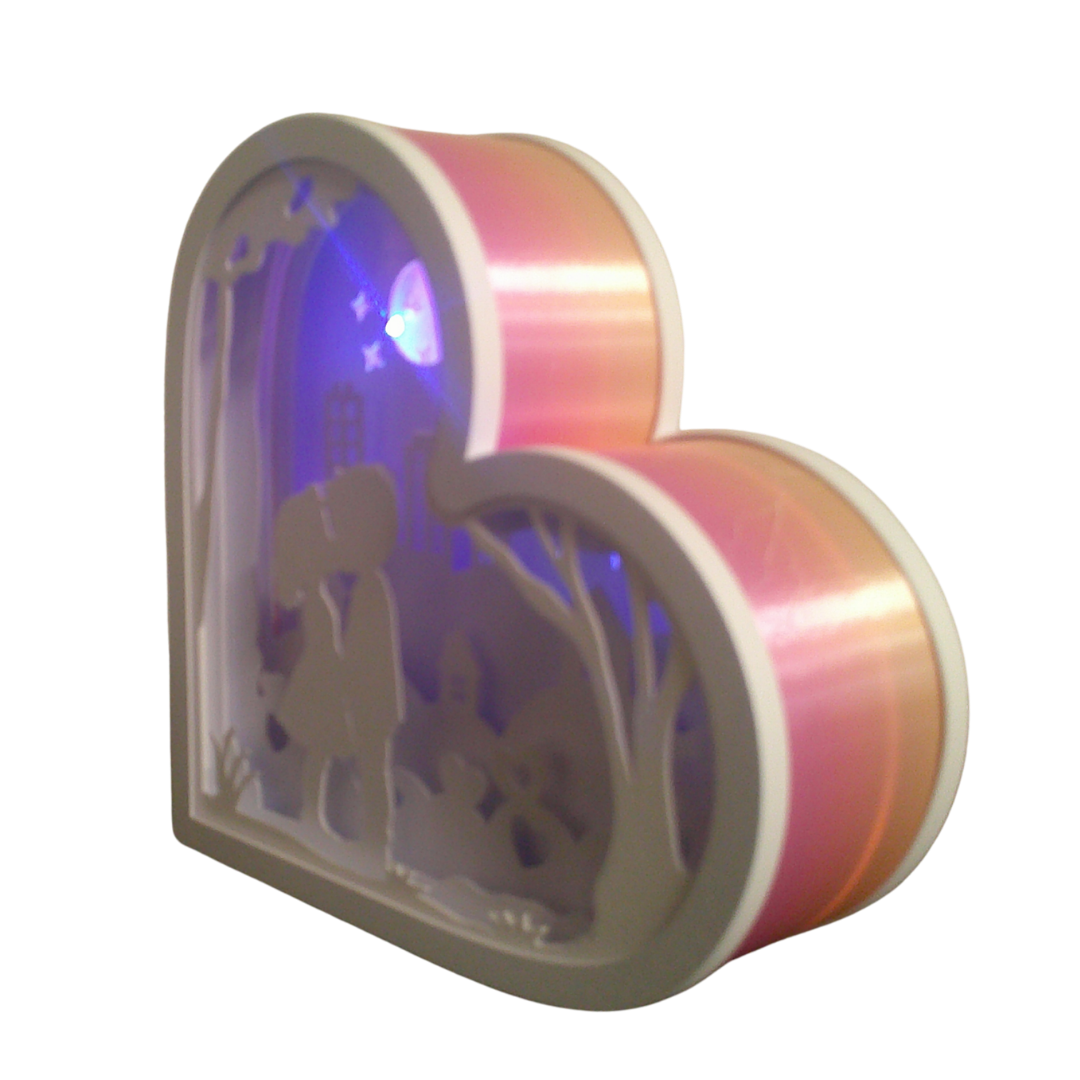 A heart-shaped silhouette light featuring a young love scene, designed to create a warm and romantic glow.